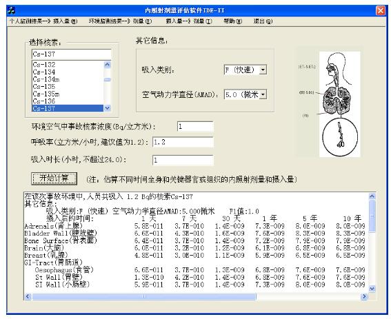 內照射劑量估算軟件可以由不同核素、不同攝入類型(急性攝入、連續攝入)、不同攝入途徑(食入、吸入、通過皮膚或傷口攝入)、不同AMAD、不同化合物類別、不同器官或/和(“和”指也可兩類監測數據同時使用)排泄物等生物樣品監測數據、或/和環境及個人空氣監測得到的監測數據進行內照射攝入量與劑量的估算。