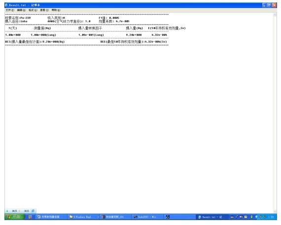 點擊“環境監測結果 --》劑量”菜單,進入由環境監測結果計算劑量”界面。其運行中的一例截圖如下圖所示: