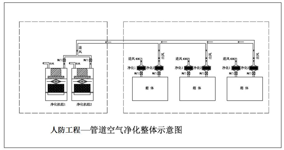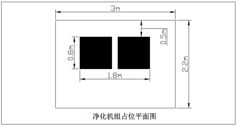 其中兩個碘凈化裝置,安放在在該空間(2.2米×3米)外,兩個凈化裝置可以輪流使用,使用兩個閥門控制;進風管與出風口均為6CM口徑,且均位于核生化凈化裝置頂部;碘吸附器大小不變,風機可適當變為800立方米每小時的。